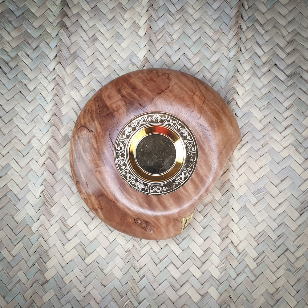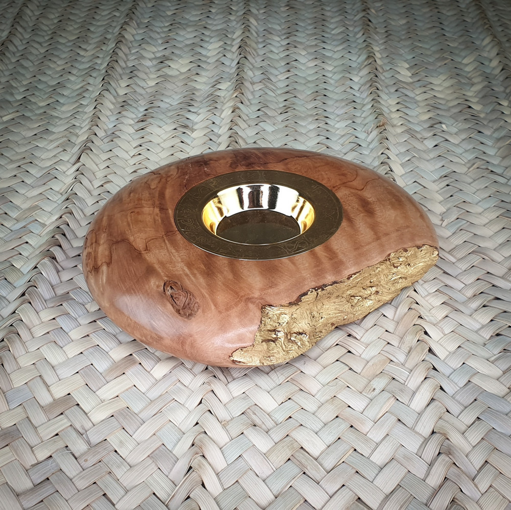 Handmade circular wooden incense burner.